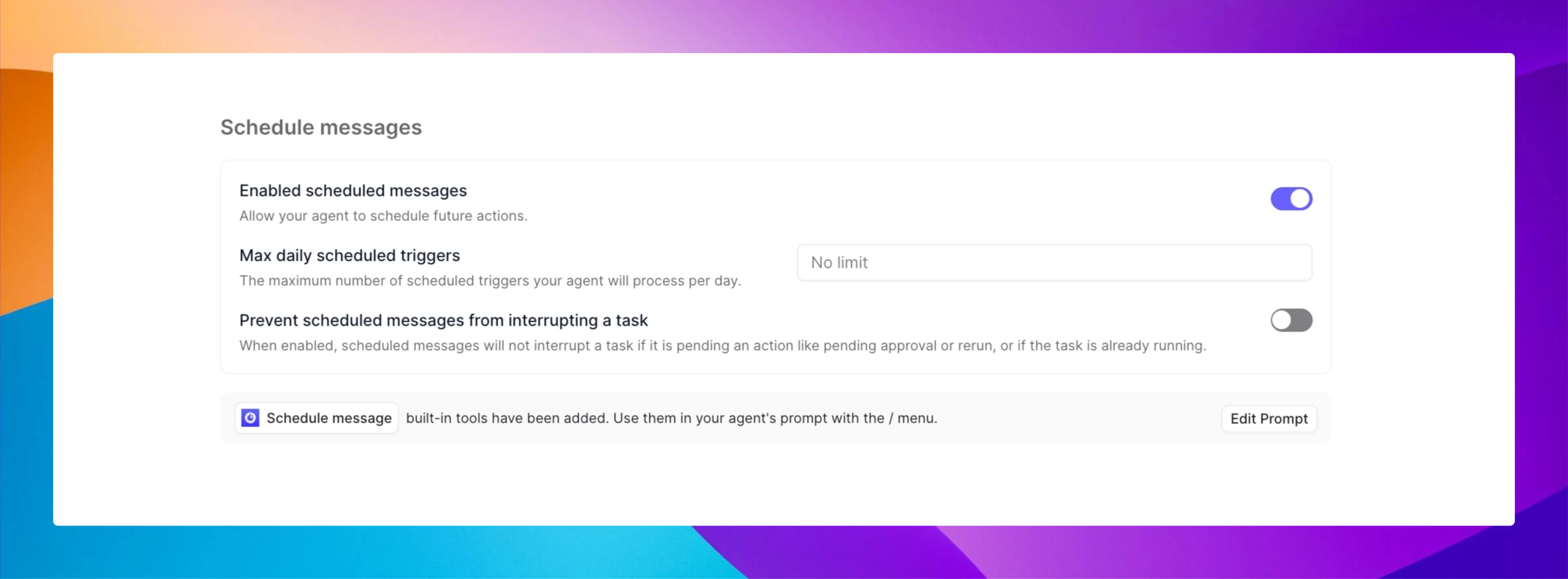 A built-in tool your Agent can use when writing prompts. Use the/schedule message shortcut inside your Agent’s instructions to tell it exactly when and what to schedule automatically during conversations.